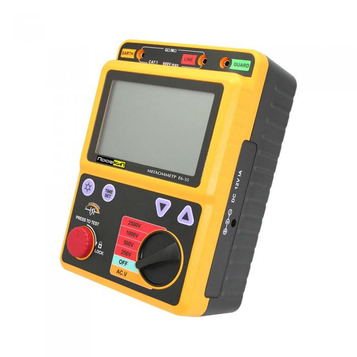 Мегаомметр цифровой ПрофКиП Е6-35 является базовым измерителем сопротивления изоляции. Измеритель сопротивления изоляции пригоден для использования для ремонта устройств и приборов на базе электромастерской. Электрический тестер имеет информативный жидкокристаллический экран большого размера. Измеритель изоляции ПрофКиП Е6-35 оснащен двухуровневой защитой от перегрузок. Тестер этой модели широко используется в энергетической отрасли. Модель ПрофКиП Е6-35 измеряет напряжение от 30 В до 600 В, т.е. одновременно может использоваться в качестве вольтметра.