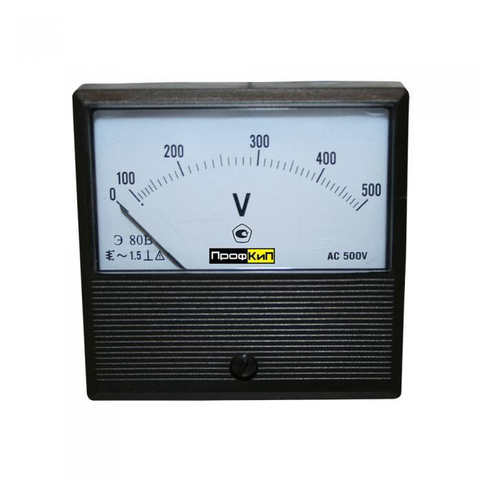 Вольтметры щитовые переменного тока ПрофКиП Э80В предназначены для напряжения переменного тока в электрических цепях. Относятся к классу электроизмерительных аналоговых, однозначных, щитовых, электромагнитной системы с неподвижной катушкой и подвижным ферромагнитным сердечником со стрелочным указателем, жестко закрепленном на оси вращения сердечника, с неравномерной шкалой и нулевой отметкой на краю диапазона измерений. Принцип действия вольтметров щитовых переменного тока ПрофКиП Э80В основан на взаимодействии магнитного поля неподвижной катушки, обтекаемой измеряемым током, с подвижным ферромагнитным сердечником. Успокоение подвижной части приборов – воздушное. Приборы имеют корректор механического нуля, расположенного на лицевой панели. Область применения вольтметров щитовых переменного тока ПрофКиП Э80В – для работы в закрытых помещениях в электроустановках промышленных предприятий, лабораторий, научно-исследовательских институтов, учебных заведений, стендах ТЭЦ, стендах ГЭС, на щитах транспортных средств МПС, в составе бортовой аппаратуры различных видов авиатранспорта, в щитах трансформаторных подстанций, в автоматизированных системах управления технологическими процессами и т.д.