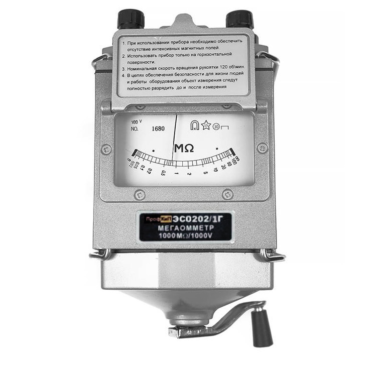 Мегаомметр ПрофКиП ЭСО202/1Г (измеритель сопротивления изоляции ПрофКиП ЭСО202/1Г) предназначен для измерения сопротивления изоляции электрических цепей, не находящихся под напряжением. Мегаомметр ПрофКиП ЭСО202/1Г применяются для измерения сопротивления изоляции электрической проводов, кабелей, разъёмов, трансформаторов, обмоток электрических машин и других устройств, а также для измерения поверхностных и объемных сопротивлений изоляционных материалов. Питание мегаомметра ПрофКиП ЭСО202/1Г осуществляется от встроенного электромеханического генератора.