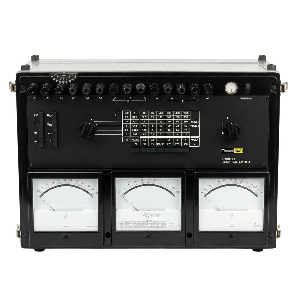 Комплект измерительный ПрофКиП К541 — стационарный электроизмерительный комплект класса точности 0,5, предназначенный для измерения силы тока, напряжения, активной и реактивной мощности в цепях переменного тока. Комплект работает в трехфазных трехпроводных сетях для измерения тока, напряжения и активной и реактивной мощности, а также в однофазных цепях переменного тока для измерения силы тока, напряжения и активной мощности. Основные области применения: измерение силы тока и напряжения в однофазных цепях при наладке, ремонте и эксплуатации электроустановок; измерение тока, напряжения, активной и реактивной мощности в трехфазных трехпроводных сетях переменного тока; контроль режимов работы трехфазных нагрузок — двигателей, трансформаторов, нагревателей и других потребителей; оценка баланса и распределения мощности по фазам в трехфазных сетях;учебные и испытательные лаборатории, где требуется демонстрация методов измерения мощности, тока и напряжения в однофазных и трехфазных цепях.