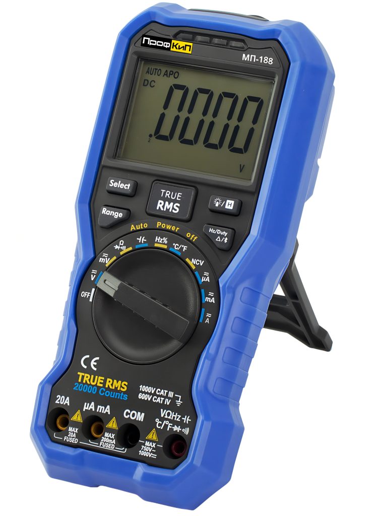| Мультиметры переносные ПрофКиП МП-188 предназначены для измерения напряжения постоянного и переменного тока, силы постоянного и переменного тока, сопротивления постоянному току, электрической ёмкости и частоты. Приборы оснащены жидкокристаллическими дисплеями для индикации результатов измерений. Мультиметры отличает компактность, незначительная масса и возможность автономного питания в различных условиях эксплуатации. Мультиметры предназначены для использования в цеховых и лабораторных условиях, при наладке и ремонте радиотехнического оборудования, электронных схем и узлов автоматики, а также при тестировании и ремонте промышленных электросетей. Высокоточный прибор для измерения параметров тока, напряжения и сопротивления. Модель позволяет работать с током AC до 10А и DC до 20А, напряжением AC до 750В и DC до 1000В, а также сопротивлением до 60МОм. Дополнительно измеряет ёмкость до 60мФ и частоту сигнала до 9999кГц. Температурный диапазон от -50 до +400°C. Инновационный дисплей с подсветкой обеспечивает четкость показаний. Функции включают встроенный фонарик, авто/ручное изменение диапазонов, HOLD, индикатор заряда батареи, бесконтактный индикатор напряжения | ||||