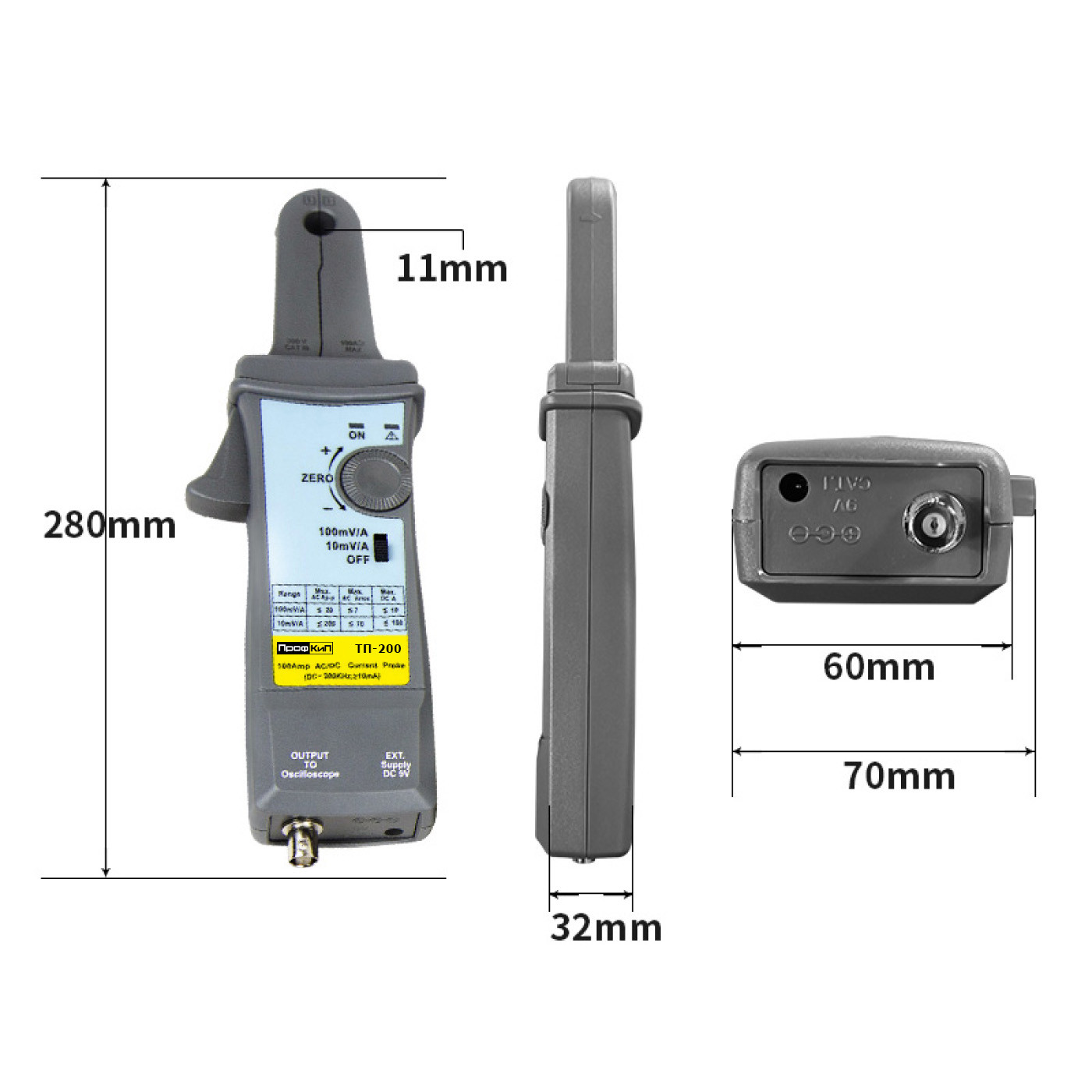 Пробники токовые ПрофКиП ТП-200 предназначены для бесконтактных измерений совместно с осциллографами амплитудных и временных параметров постоянного и переменного электрического тока, протекающего в различных электрических цепях. Токовые пробники ПрофКиП предназначены для регистрации тока и последующего преобразования его в соответствующий сигнал напряжения с подачей на вход осциллографа. Токовые пробники могут с высокой точностью и разрешением измерять значения как постоянного, так и переменного тока в широком диапазоне частот. Пробники применяются для передачи сигналов с минимальными искажениями от объекта измерений к входам осциллографа при проведении исследовательских и испытательных работ в лабораторных и производственных условиях.